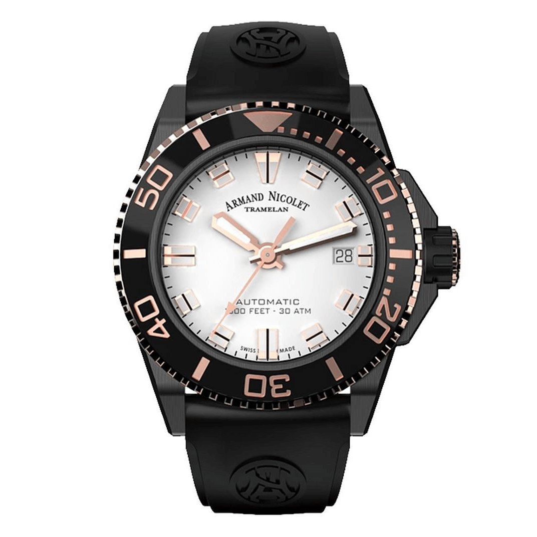 Movement: Mechanical, Automatic With A Power Reserve Of 38 Hours - Calibre Date AN200 (Based On SW-200 Modified Per Armand Nicolet’s Specifications).Case: 41mm X 13mm Stainless Steel 316L Case - Case With Antiglare Treated Sapphire Crystal On Top And Screwed Back - Unidirectional Turning Ceramic Bezel - D.L.C Black Stainless Steel 316L With Turning Black Ceramic Bezel - Exhibition Caseback.Dial: Silver and Gold Rose Dial - Guilloché Dial With Luminous Applied Indexes And Hands.Strap / Bracelet: Black Rubber Strap with D.L.C Stainless Steel Deployment Buckle.