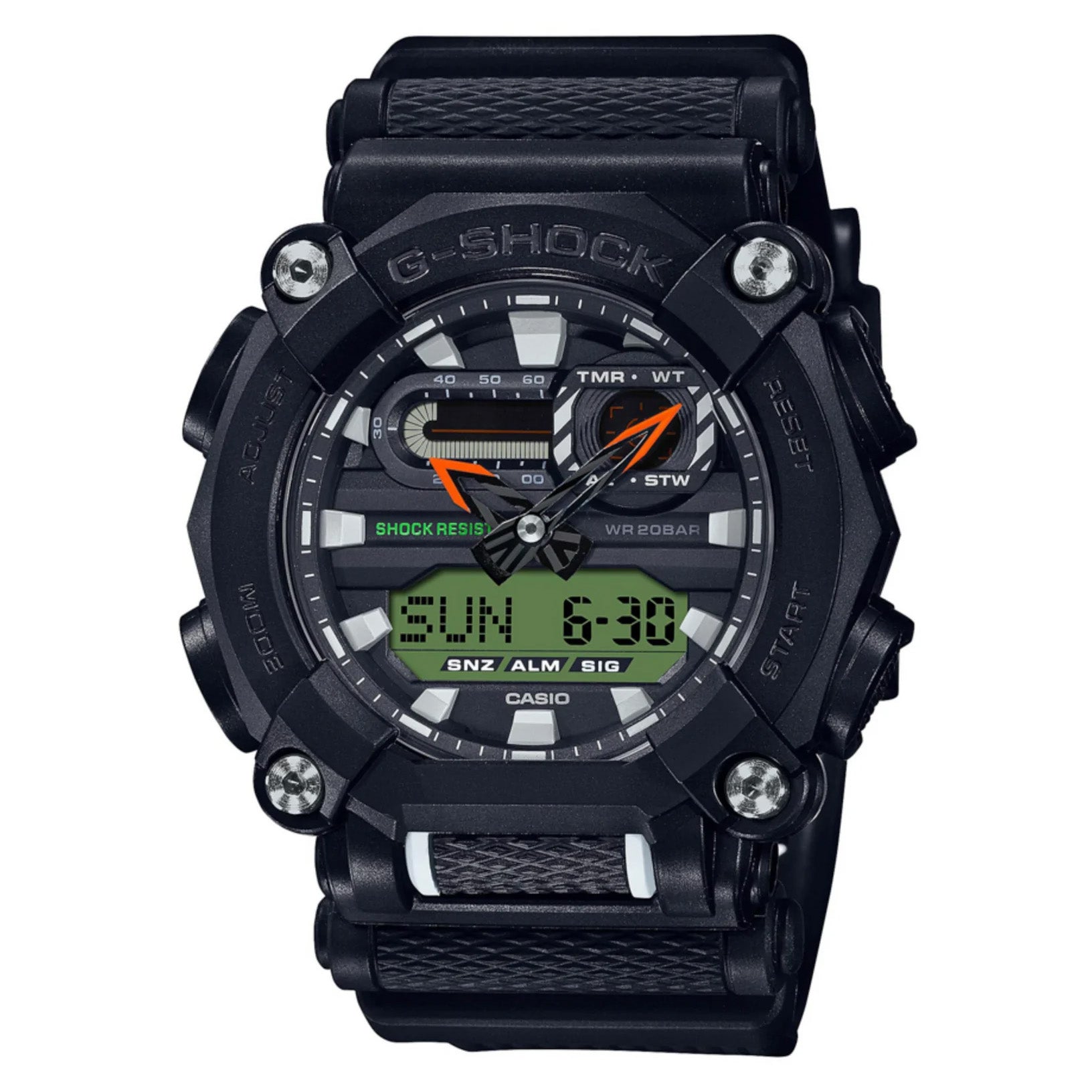 Japanese Quartz Movement. World Time, Stopwatch, Timer, Alarm, Flash Alert and Automatic Calendar Functions.51.4mm x 46.8mm x 15.5mm Black Resin and Stainless Steel Case. Characteristic Shock-Proof Case with Easy to Press Button ArrangementGreen Digital Dial with Three "Eyes" Digital Graphics, Green and Grey Accents, and Scratch Resistant Mineral Crystal.24mm Black Resin Strap with Stainless Steel Pin BuckleWater Resistant to 200 Metres 20ATM