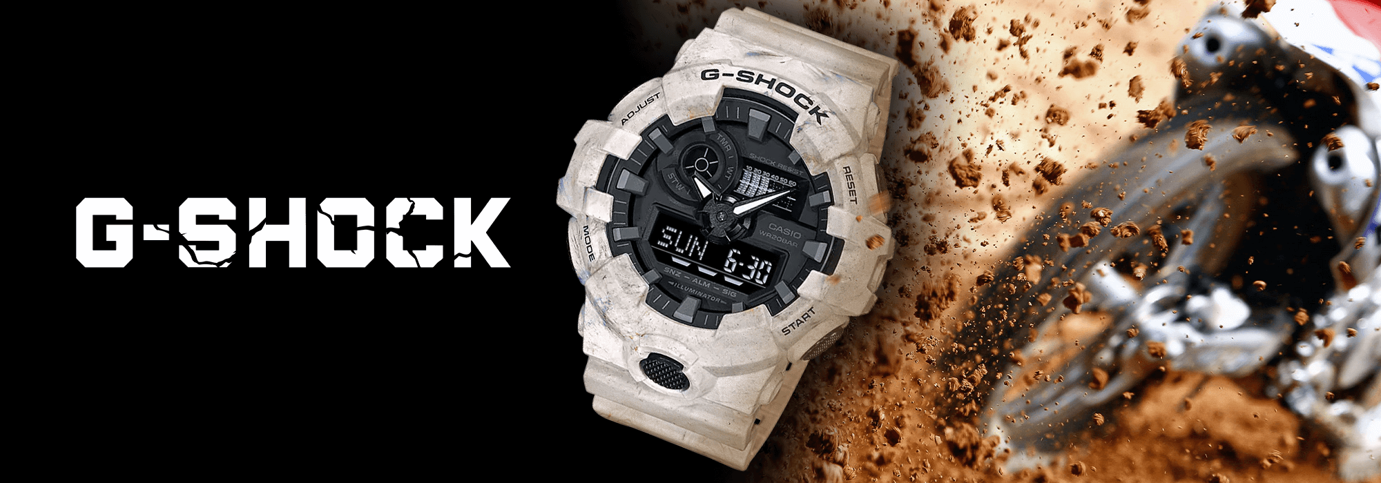 Japanese Quartz Movement. World Time, Stopwatch, Timer, Alarm, and Automatic Calendar Functions.54.1mm x 48.6mm x 15.5mm Black Resin and Stainless Steel Round Case. Easy to Press Button Arrangement on Characteristic Shock-Proof Case.Silver and Neon Digital Camo Analog-Digital Combination Dial with Black and Neon Arrow Hands and Neon Baton Markers. Digital Display at 6 O'Clock. Scratch Resistant Mineral Crystal.30mm Black Resin Strap with Pin BuckleWater Resistant to 200 Metres 20ATM