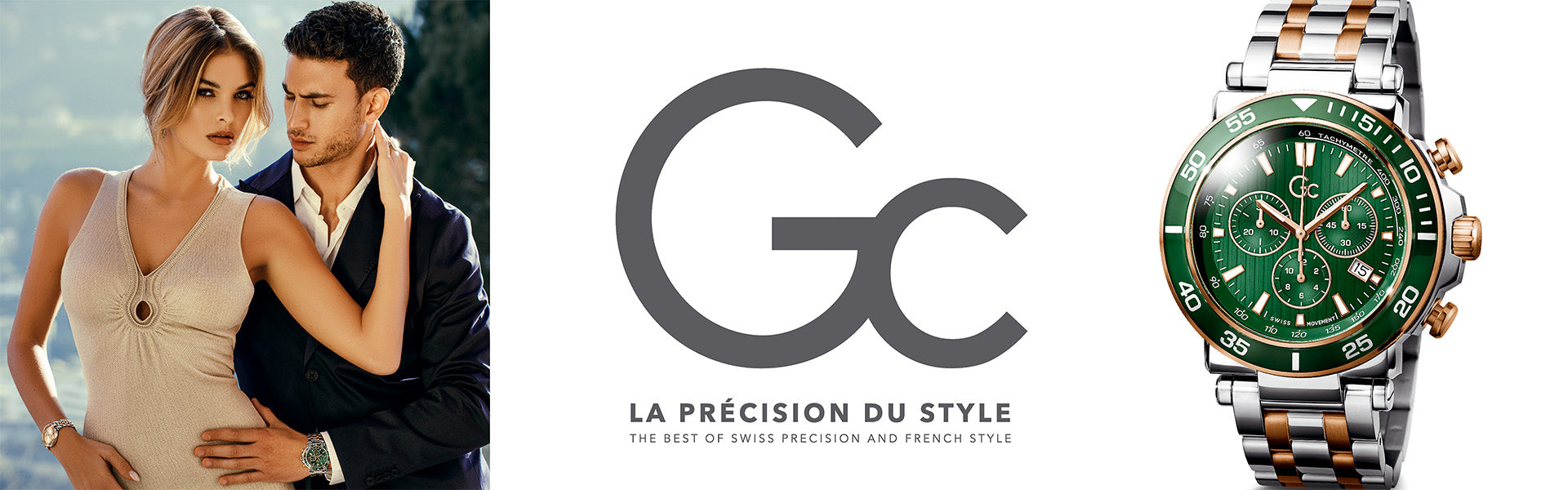 Add a touch of refinement to your everyday wardrobe with the Gc Flair. It has a distinctive notched bezel and a comfortable, supple five links bracelet and, for all yellow gold tone version, an eye-catching green dial with a visible day date swiss movement through windows at 3 and 6 o'clock.