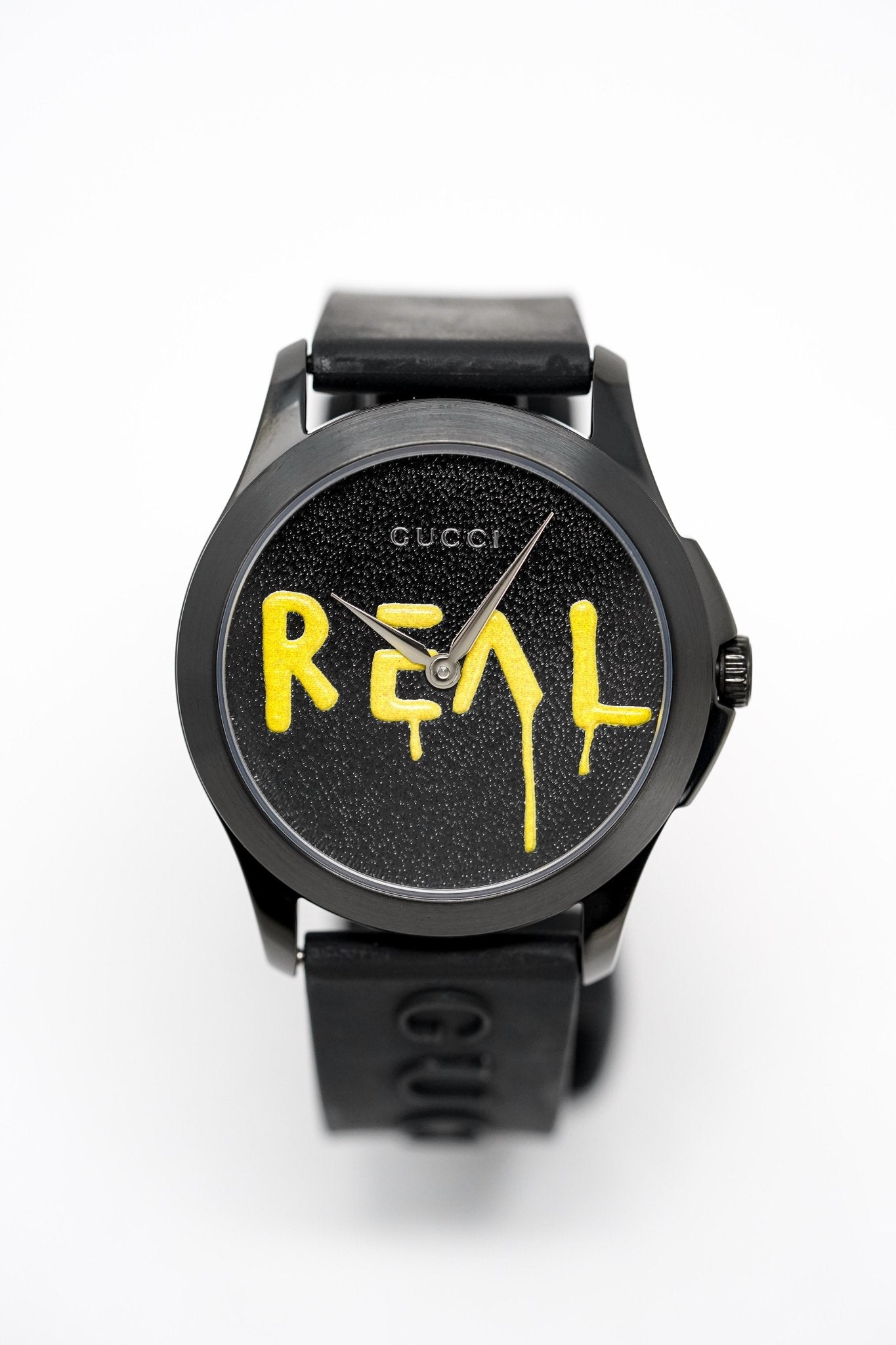 Black Dial with Yellow Graffiti that Spells Real. Stainless Steel Hands.