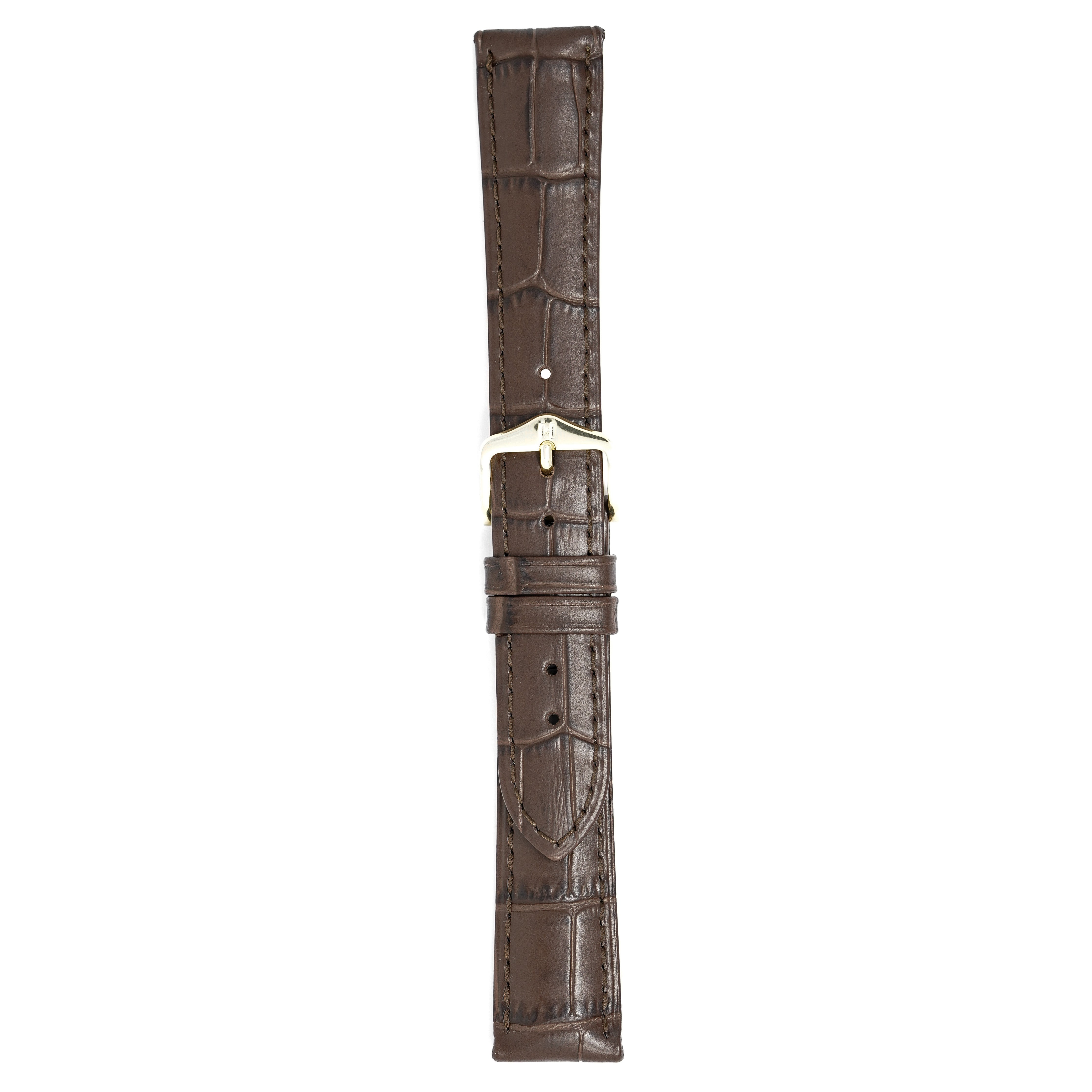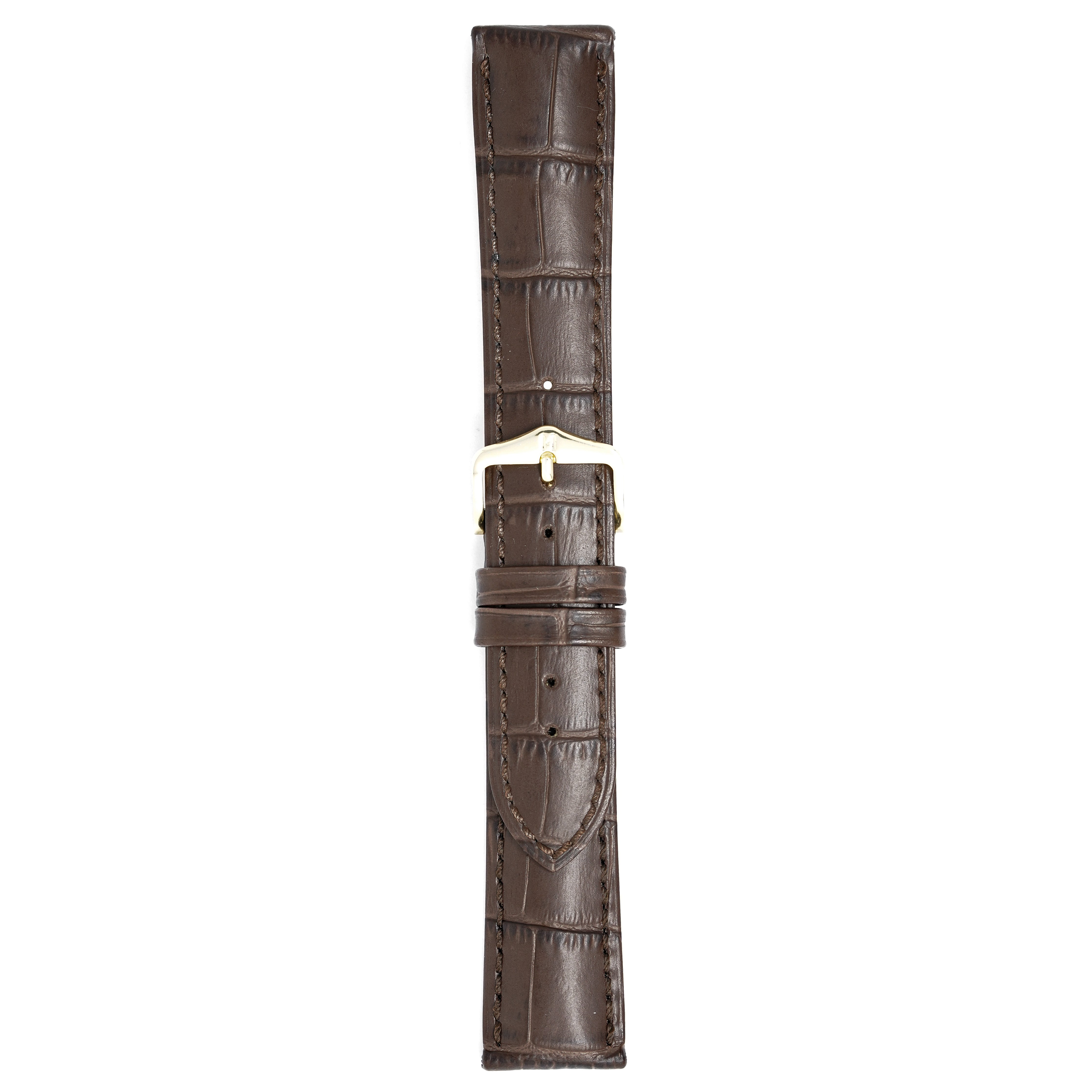 20mm width x 20cm Length Dark Brown Alligator Embossed Leather Strap with Brown Stitchings - Fitted With a Polished Gold Plated Stainless Steel Buckle. Upper Layer: Alligator-Embossed Italian Calfskin Lower Layer: Soft-Glove Leather Lining Water resistance: Splash Resistant The Strap is Brand New.