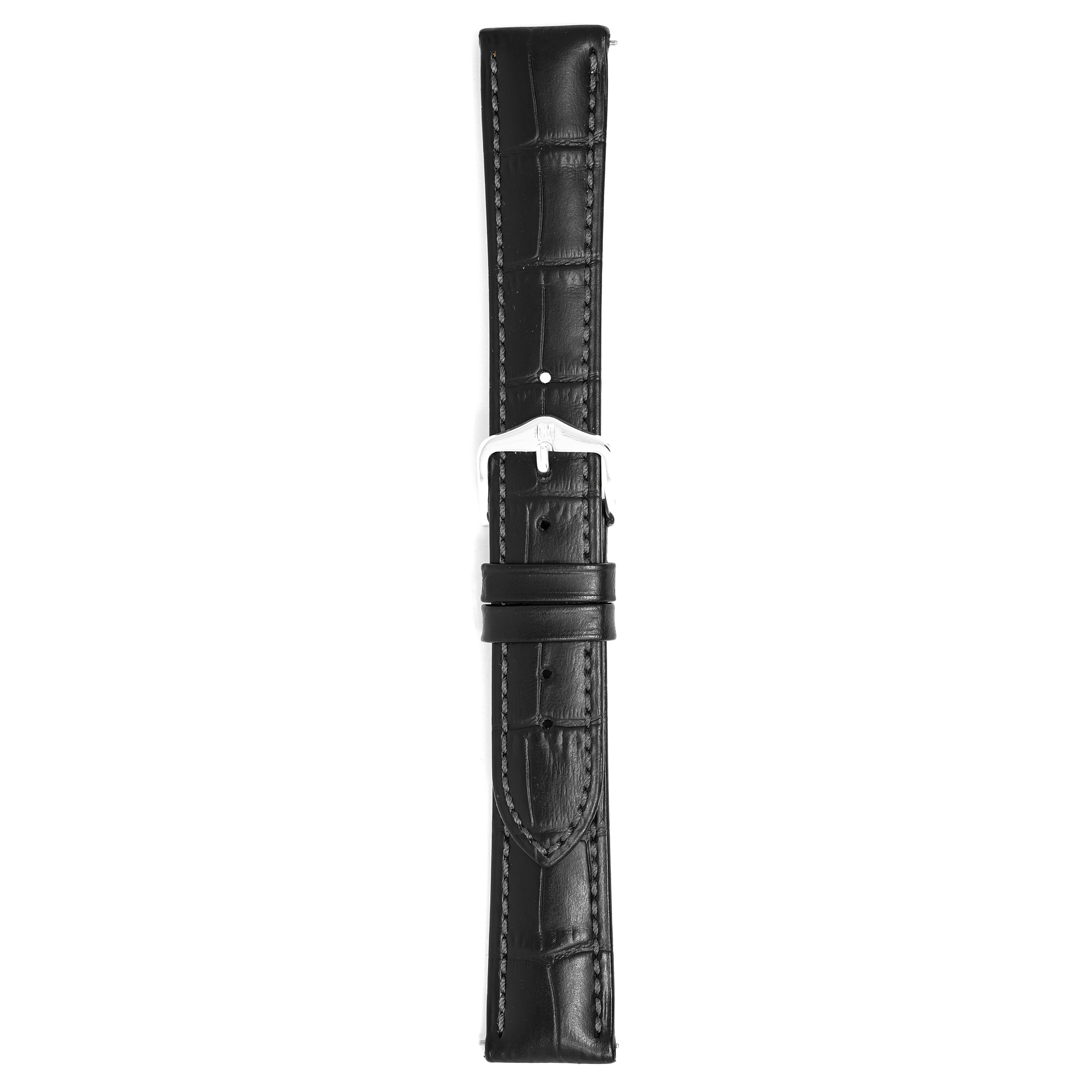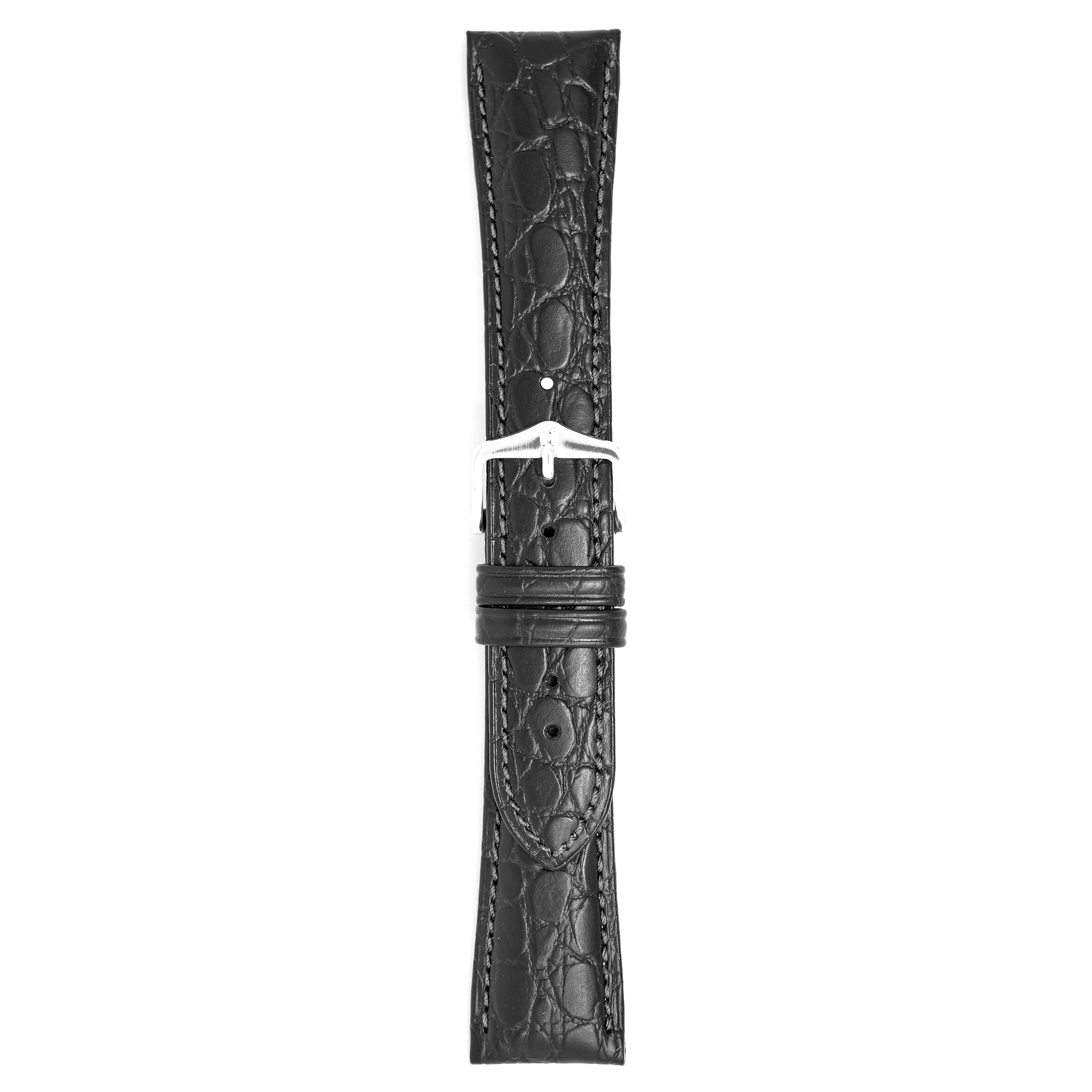 22mm width x 20cm Length Black Crocodile Embossed Leather Strap with Dark Grey Stitchings - Fitted With a Polished Stainless Steel Buckle. Upper Layer: Crocodile Flank-Embossed Italian Calfskin Lower Layer: Soft-Glove Leather Lining Water resistance: Splash Resistant The Strap is Brand New.