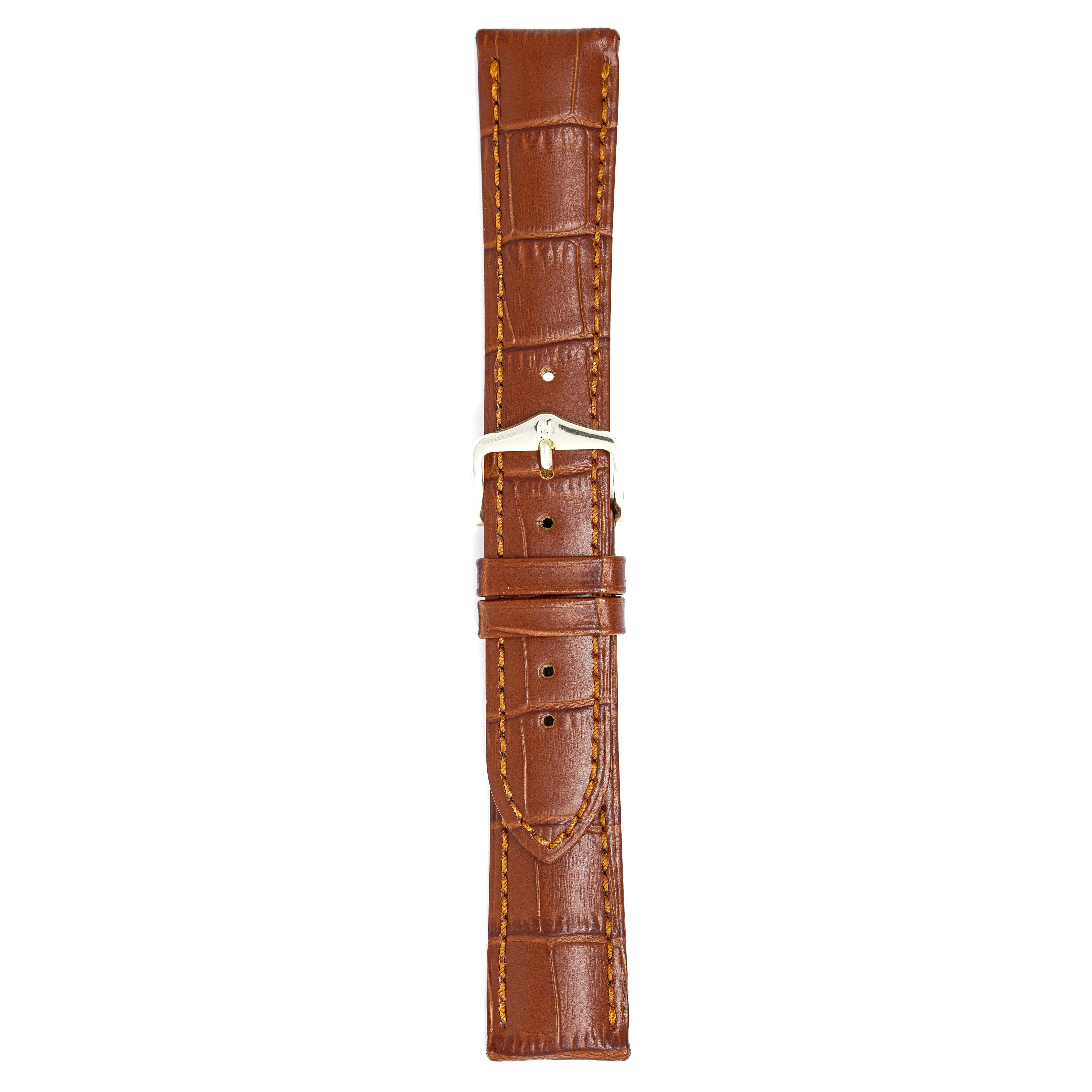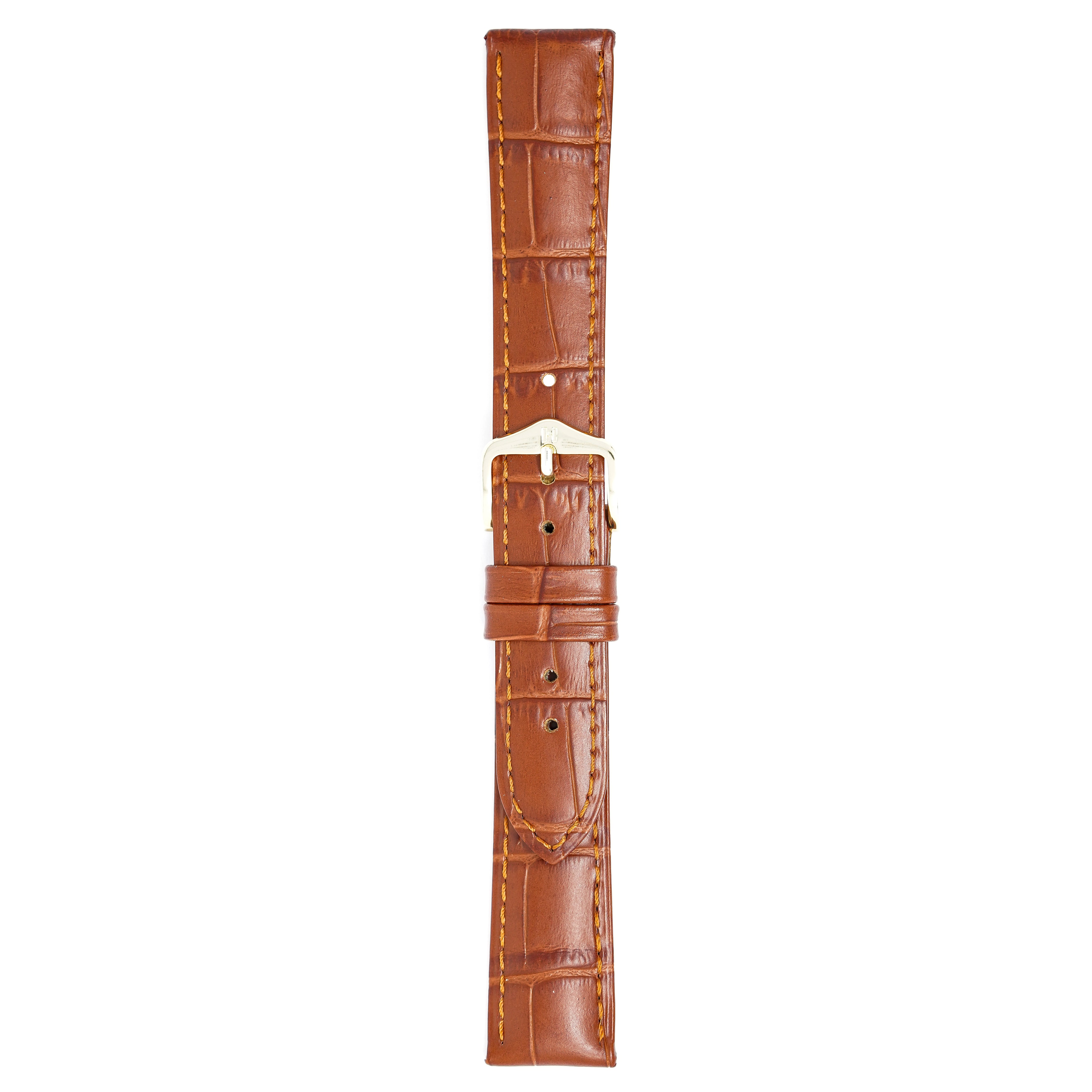 20mm width x 20cm Length Brown Alligator Embossed Leather Strap with White Stitchings - Fitted With a Polished Stainless Steel Buckle. Upper Layer: Alligator-Embossed Italian Calfskin Leather Lower Layer: Soft-Glove Leather Lining Water resistance: Splash Resistant The Strap is Brand New.
