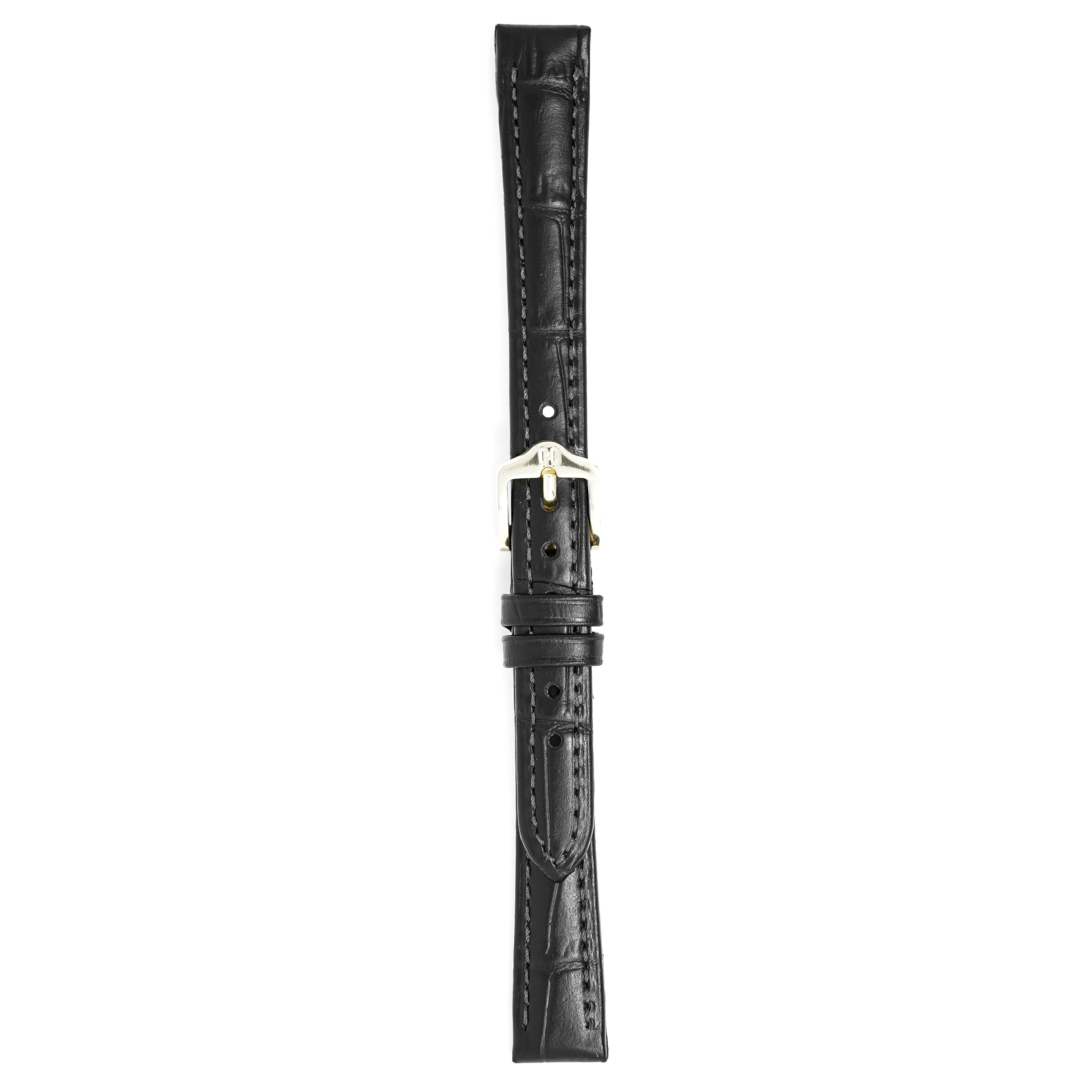 12mm width x 18cm Length Black Alligator Embossed Leather Strap with Black Stitchings - Fitted With a Polished Gold Plated Stainless Steel Buckle. Upper Layer: Alligator-Embossed Italian Calfskin Lower Layer: Soft-Glove Leather Lining Water resistance: Splash Resistant The Strap is Brand New.