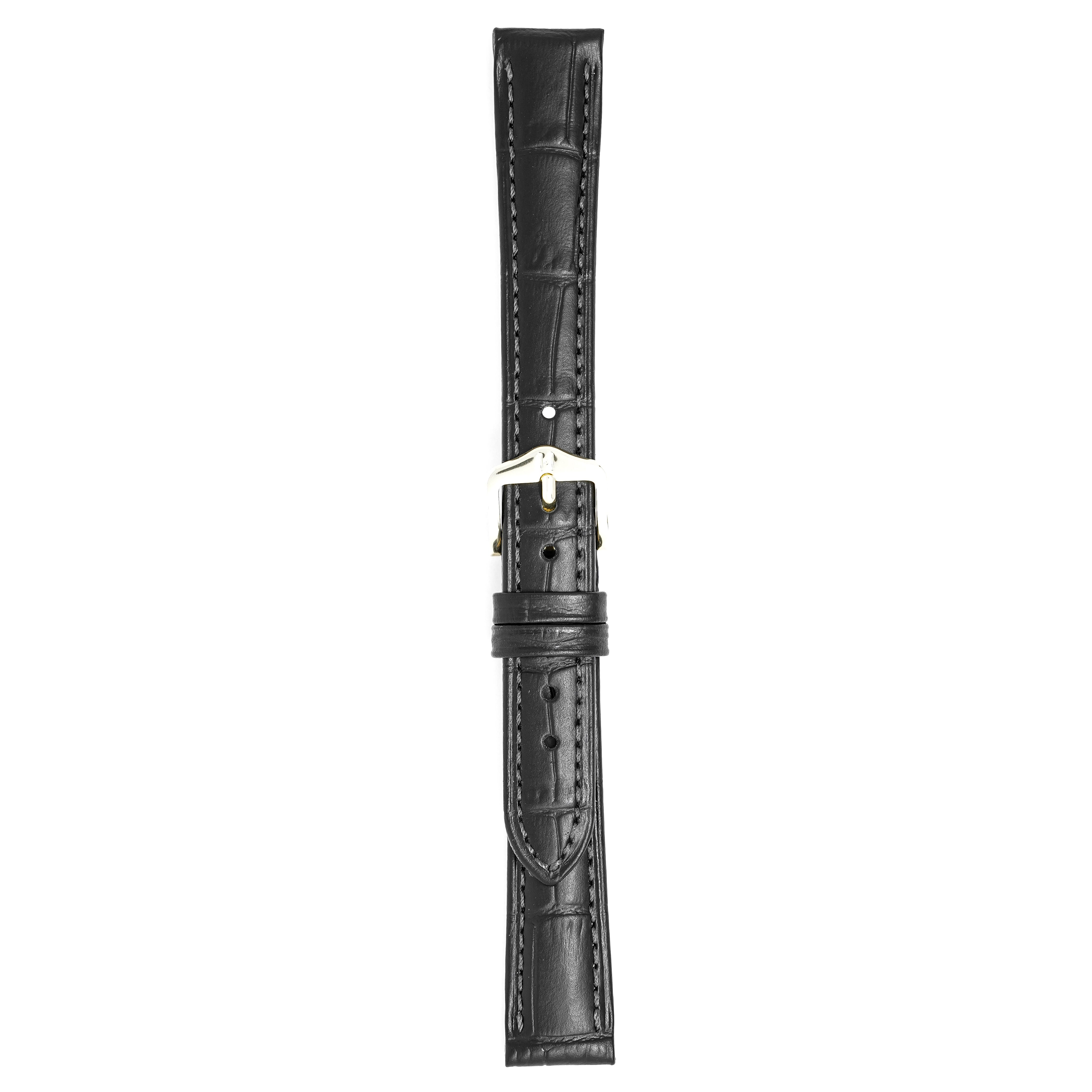 18mm width x 20cm Length Black Alligator Embossed Leather Strap with Black Stitchings - Fitted With a Polished Stainless Steel Buckle. Upper Layer: Alligator-Embossed Italian Calfskin Lower Layer: Soft-Glove Leather Lining Water resistance: Splash Resistant The Strap is Brand New.