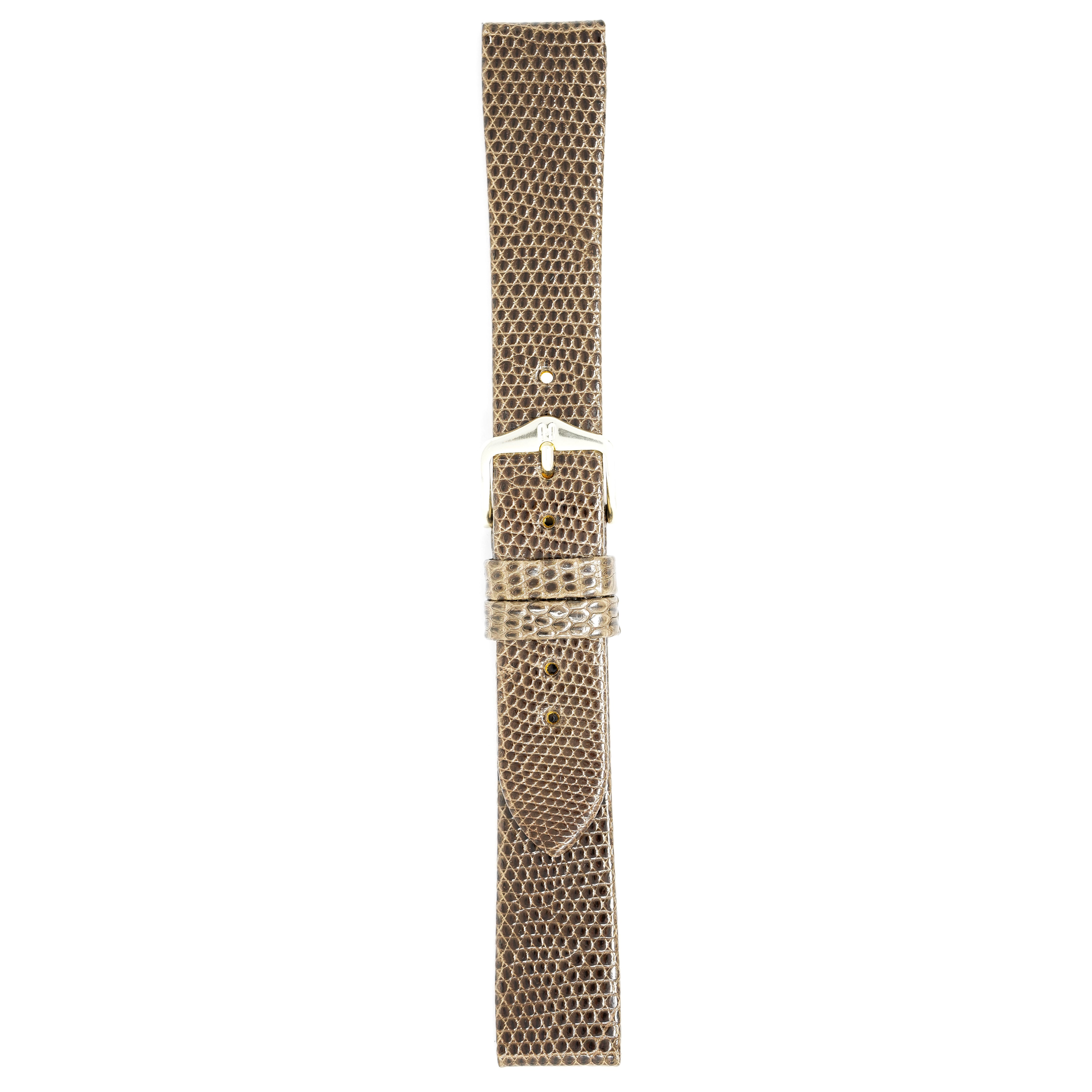 18mm width x 20cm Length Brown Lizard Leather Strap - Fitted With a Polished Gold Plated Stainless Steel Buckle. Upper Layer: Genuine Lizard Leather Lower Layer: Velvet Glove Leather Lining Water resistance: Splash Resistant The Strap is Brand New.