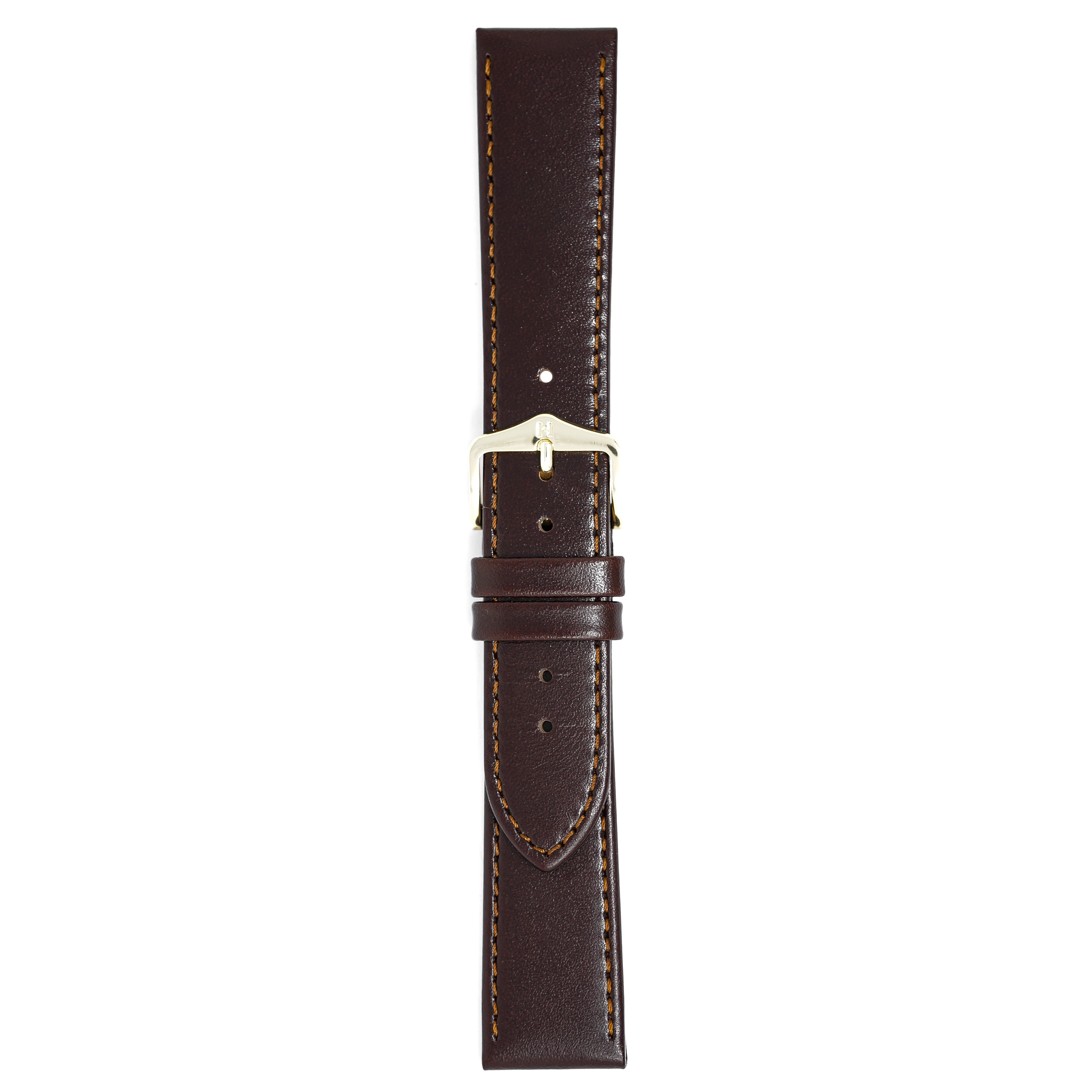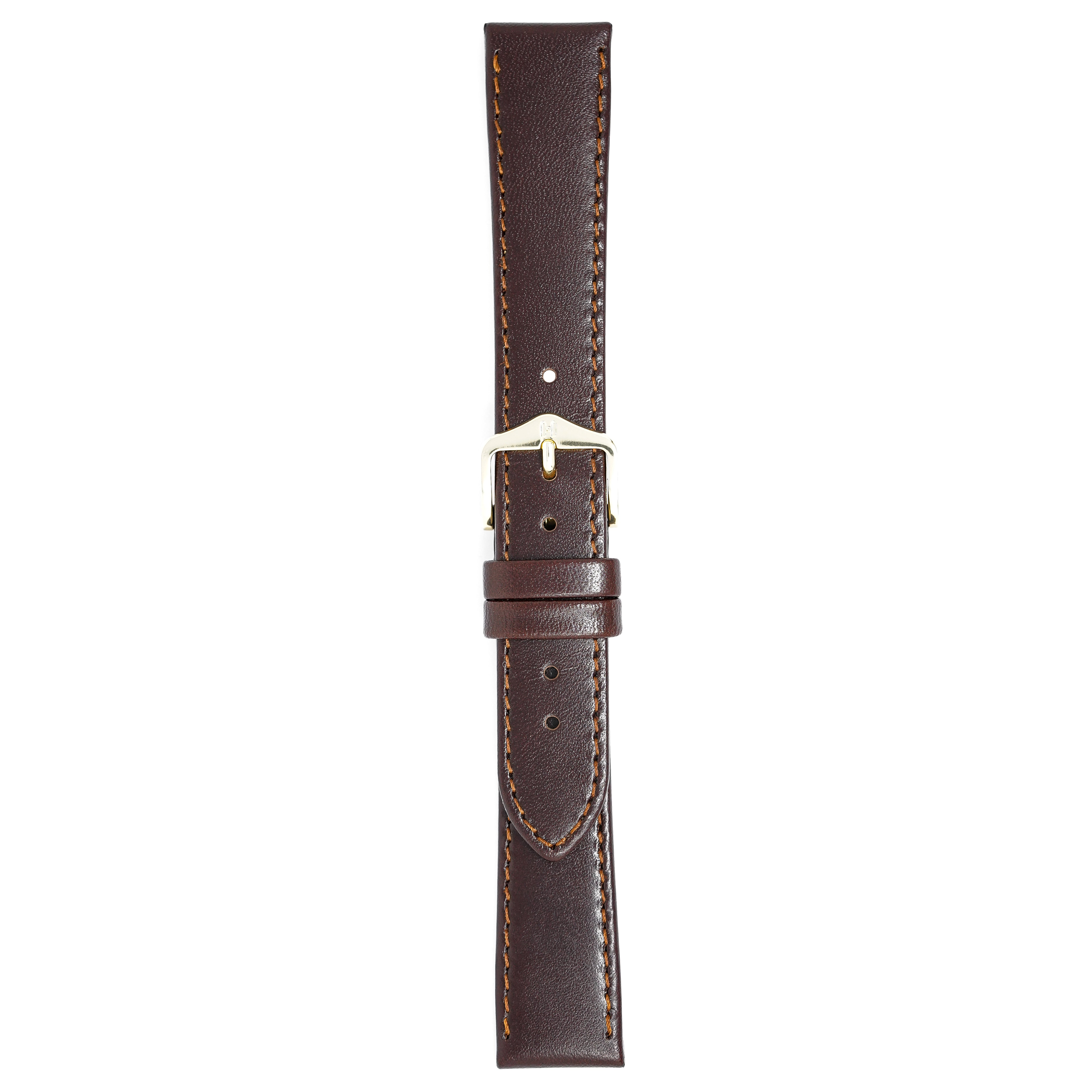 18mm width x 20cm Length Dark Brown Leather Strap with Brown Stitchings - Fitted With a Polished Gold Plated Stainless Steel Buckle. Upper Layer: Fine-Grained Calfskin Leather Lower Layer: Soft-Glove Leather Lining Water resistance: Splash Resistant The Strap is Brand New.