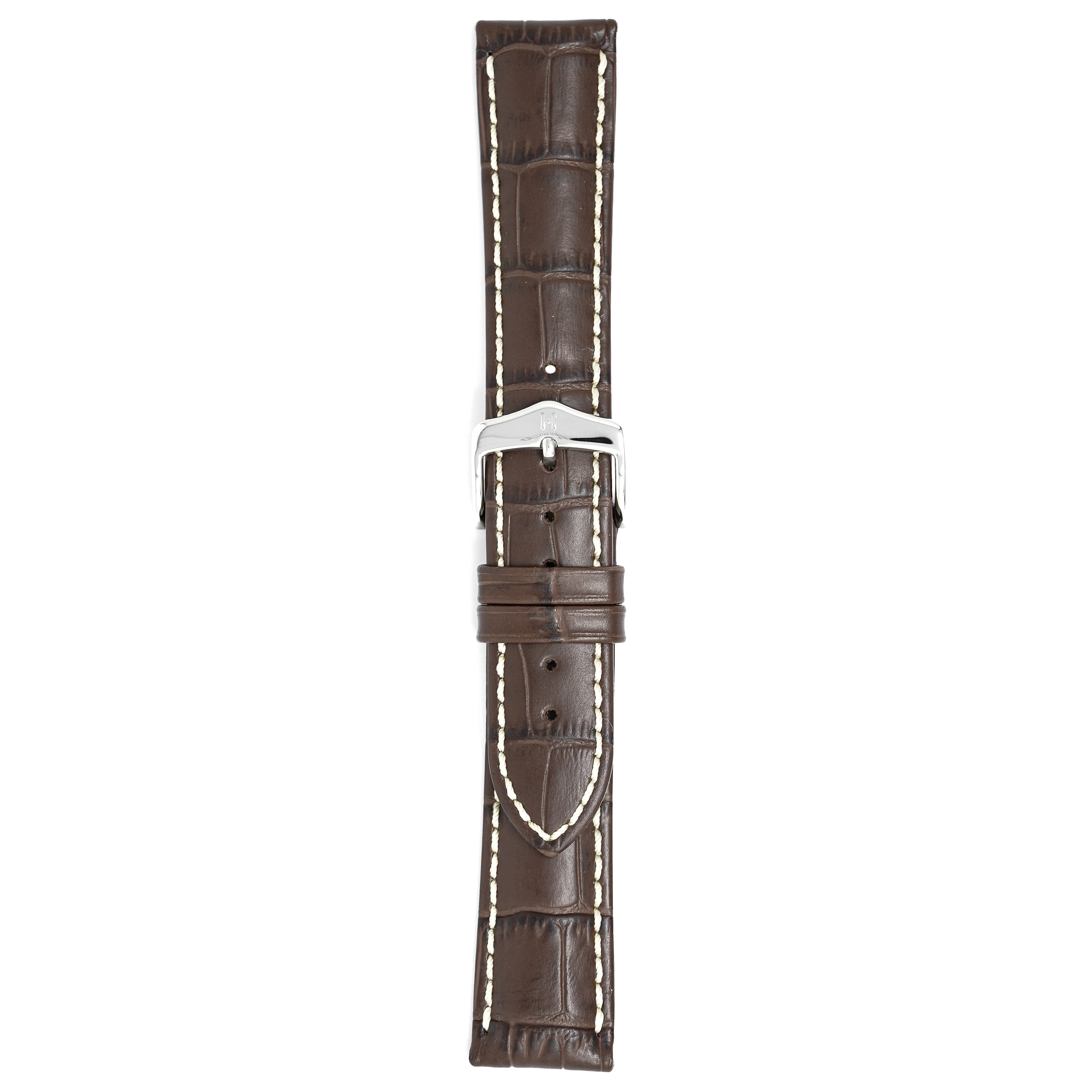 22mm width x 20cm Length Dark Brown Crocodile Embossed Leather Strap with Brown Stitchings - Fitted With a Polished Stainless Steel Buckle. Upper Layer: Crocodile Flank-Embossed Italian Calfskin Lower Layer: Soft-Glove Leather Lining Water resistance: Splash Resistant The Strap is Brand New.