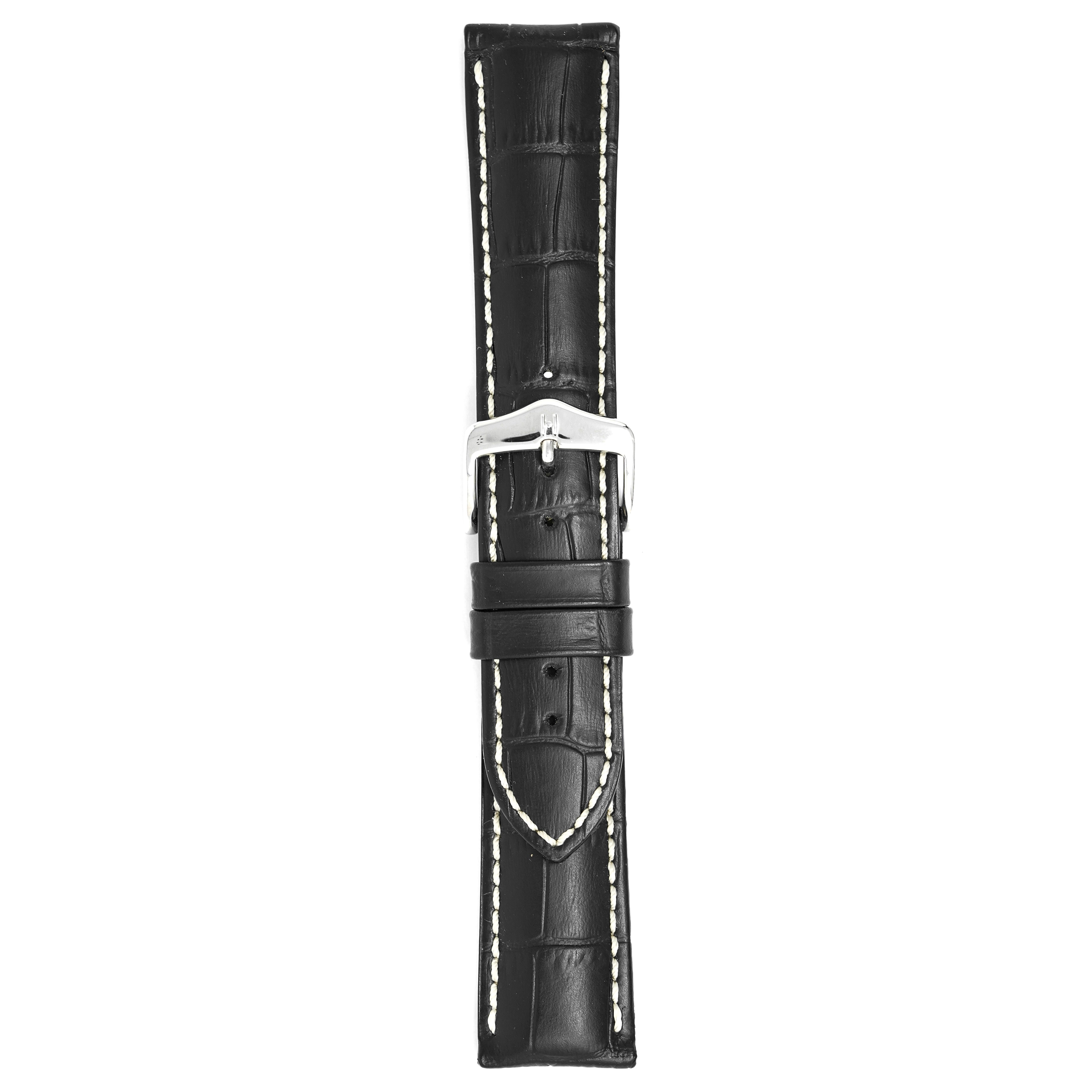 22mm width x 20cm Length Black Alligator Embossed Leather Strap with White Stitchings - Fitted With a Polished Stainless Steel Buckle. Upper Layer: Alligator-Embossed Italian Calfskin Leather Lower Layer: Soft-Glove Leather Lining Water resistance: Splash Resistant The Strap is Brand New.