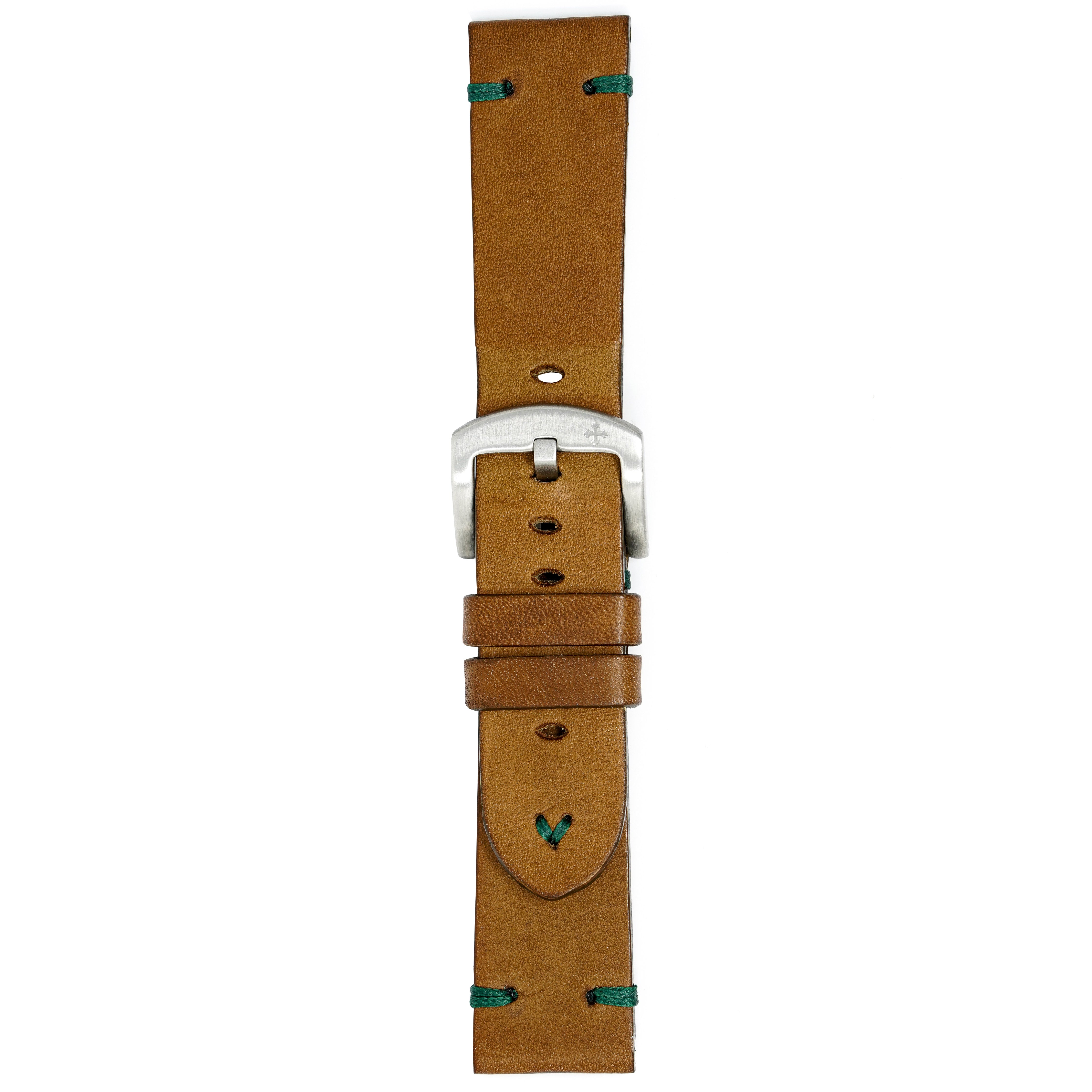 22/20mm width x 21.5cm Length Brown Handmade in Italy Leather Strap with Green Stitchings - Fitted With a Brushed Stainless Steel Buckle.