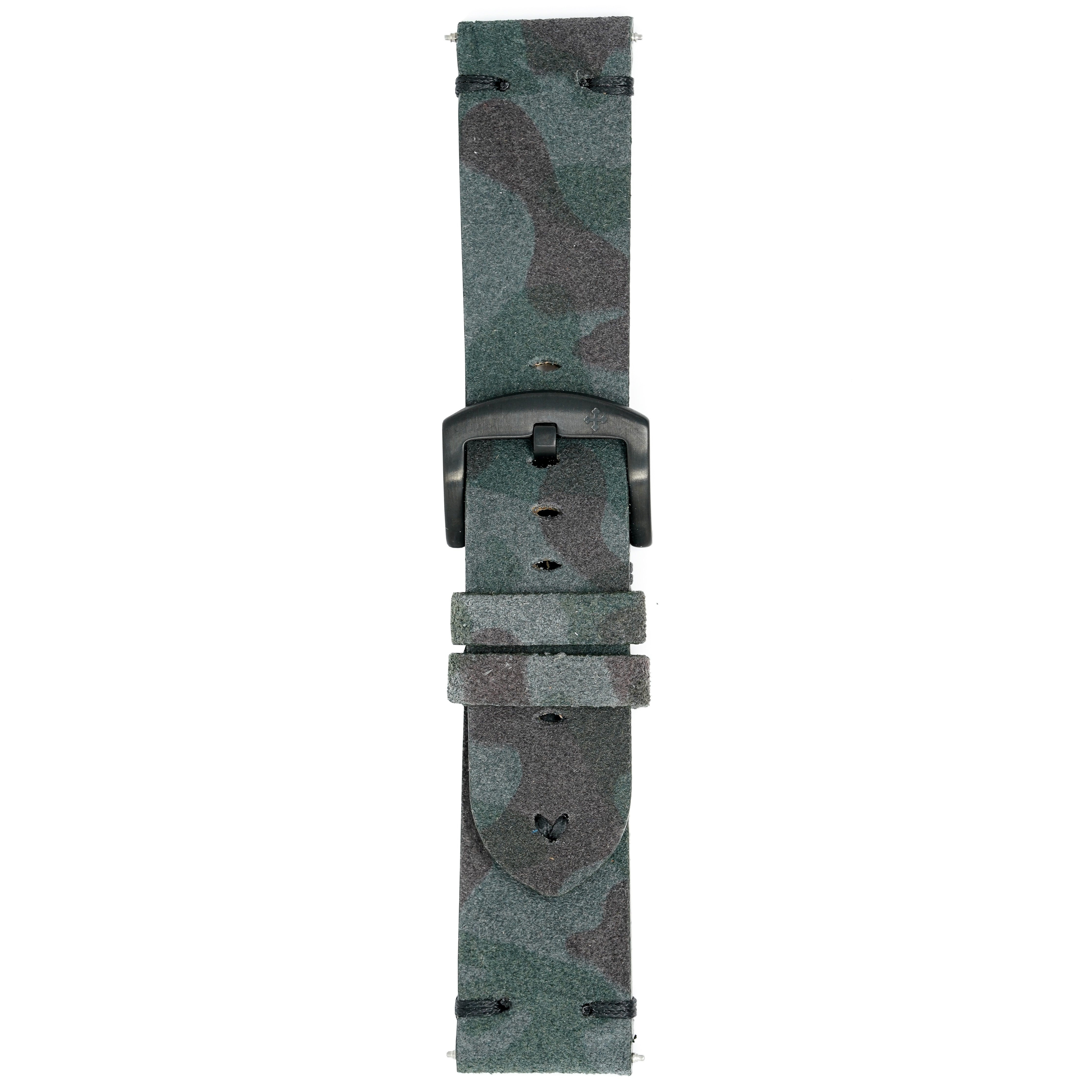 24/22mm width x 21.5cm Length Blue Camo Handmade in Italy Leather Strap with Navy Stitchings - Fitted With a Brushed Black PVD Stainless Steel Buckle.