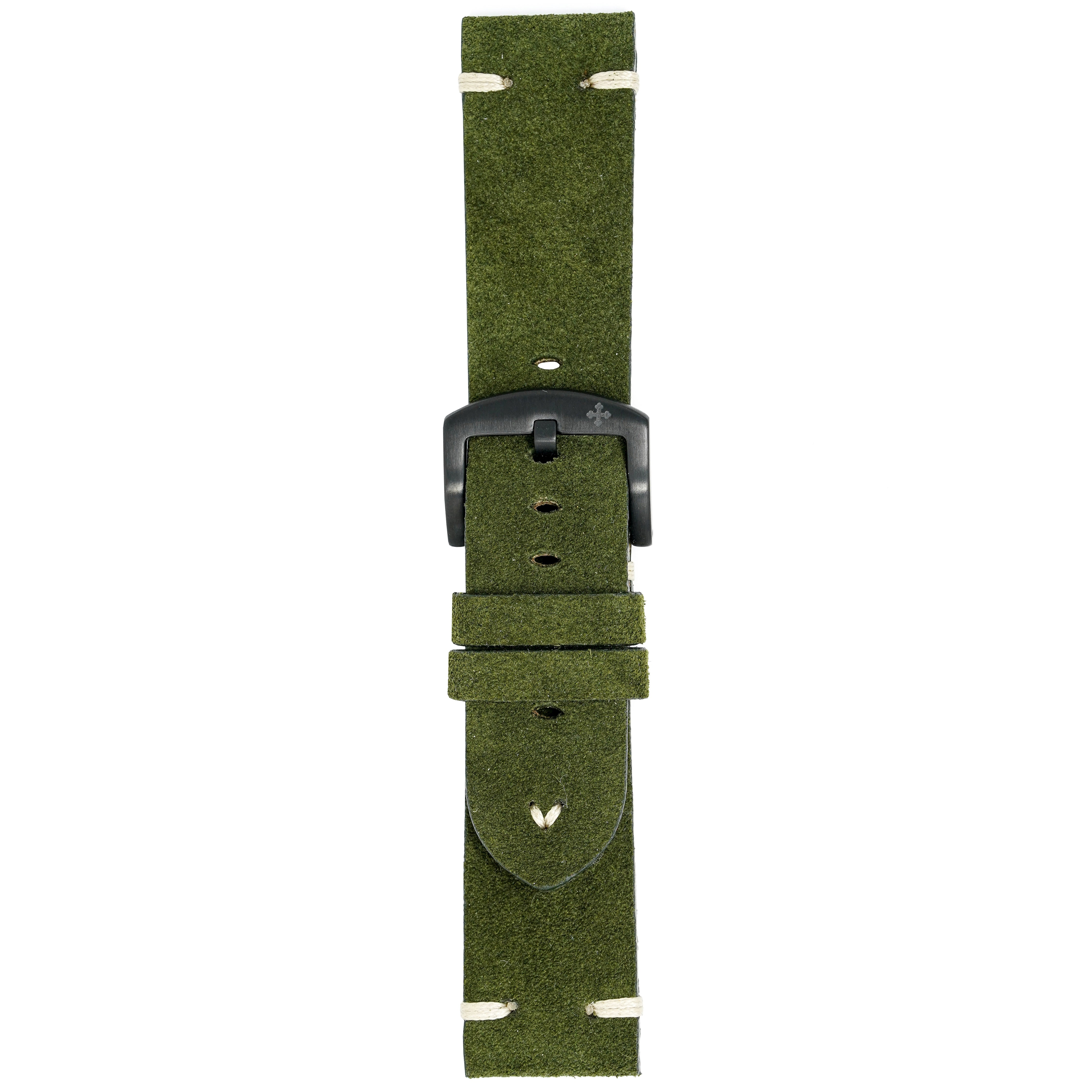 24/22mm width x 21.5cm Length Green Handmade in Italy Leather Strap with White Stitchings - Fitted With a Brushed Black PVD Stainless Steel Buckle.