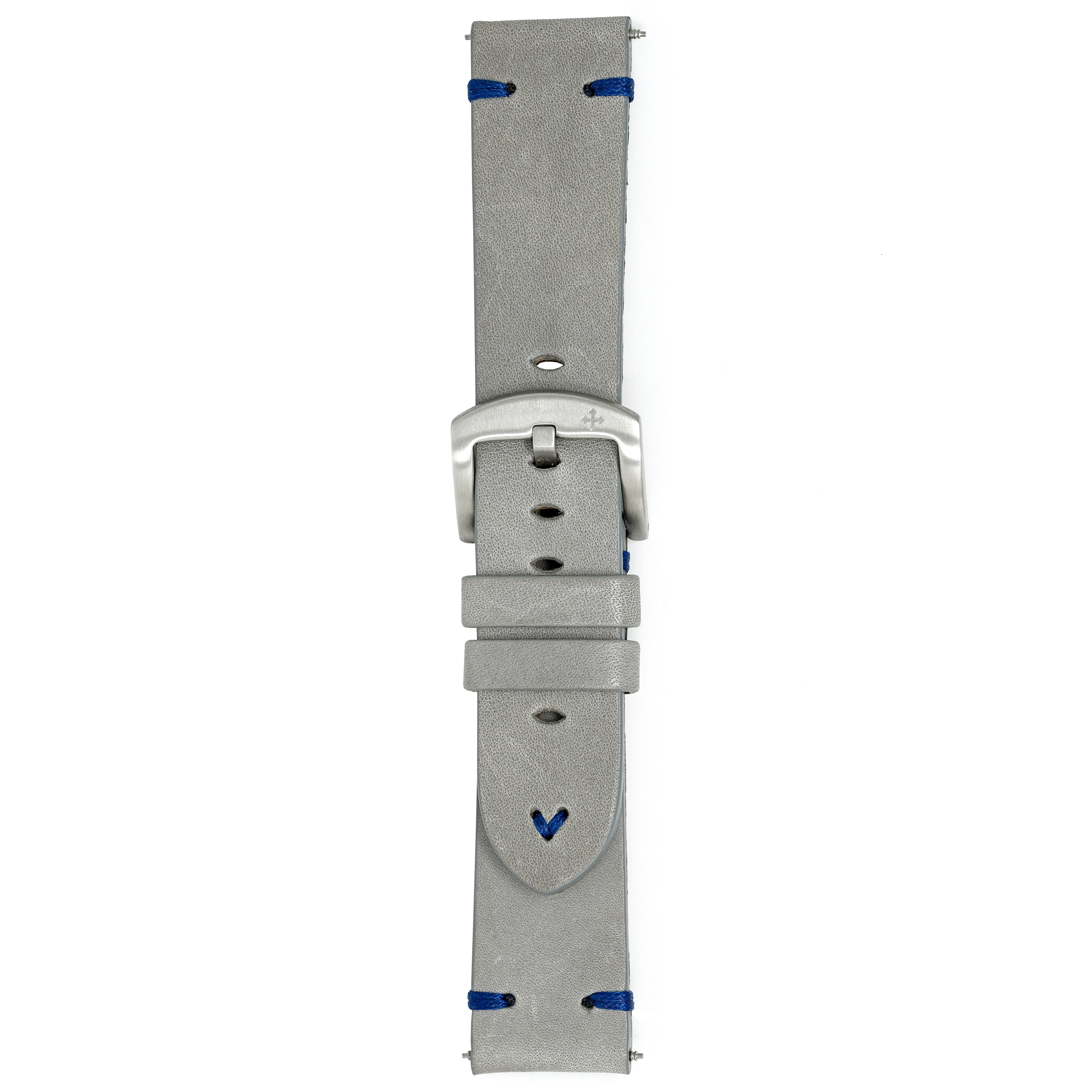 22/20mm width x 21.5cm Length Grey Handmade in Italy Leather Strap with Blue Stitchings - Fitted With a Brushed Stainless Steel Buckle.
