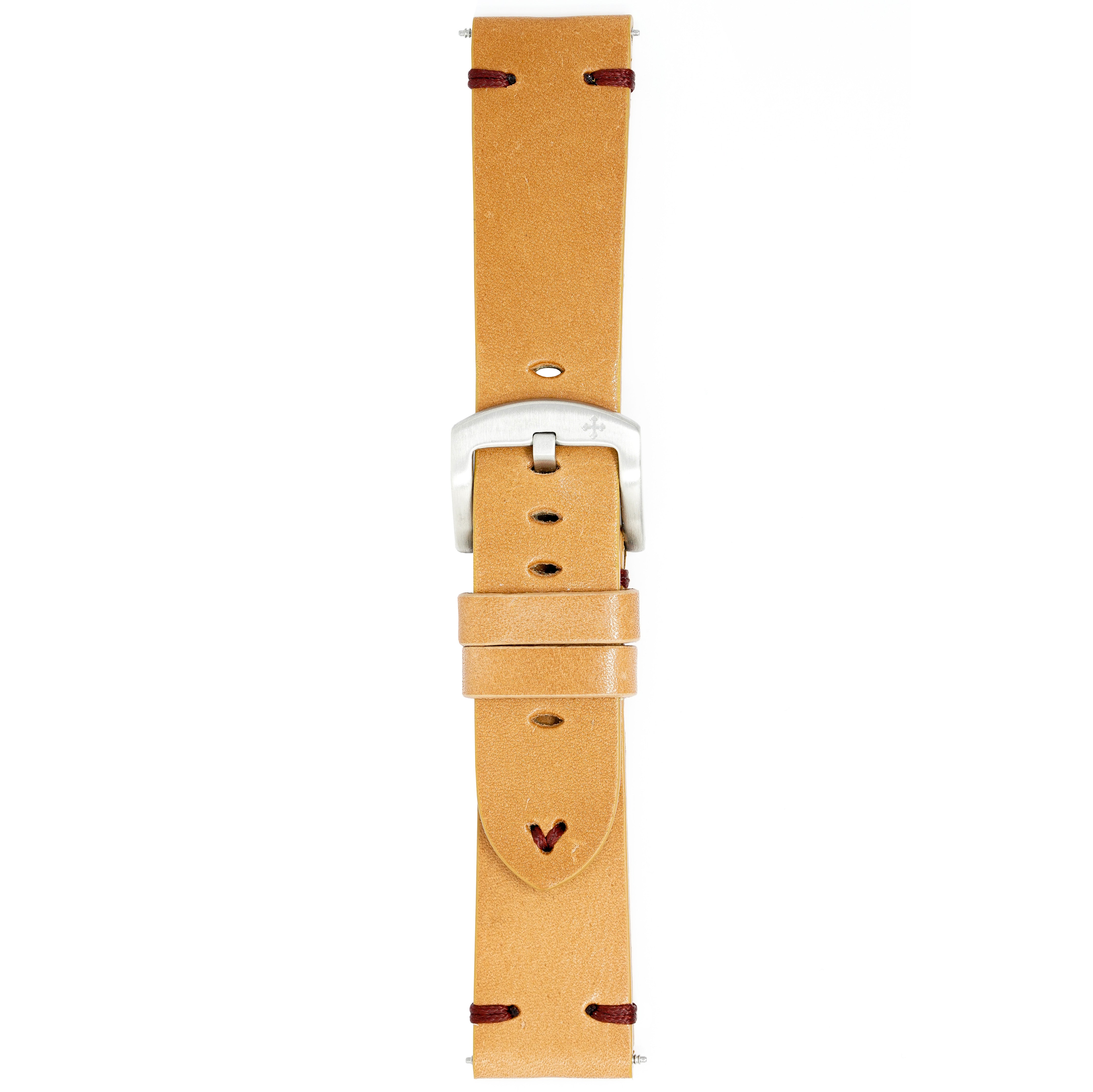 22/20mm width x 21.5cm Length Tan Handmade in Italy Leather Strap with Red Stitchings - Fitted With a Brushed Stainless Steel Buckle.