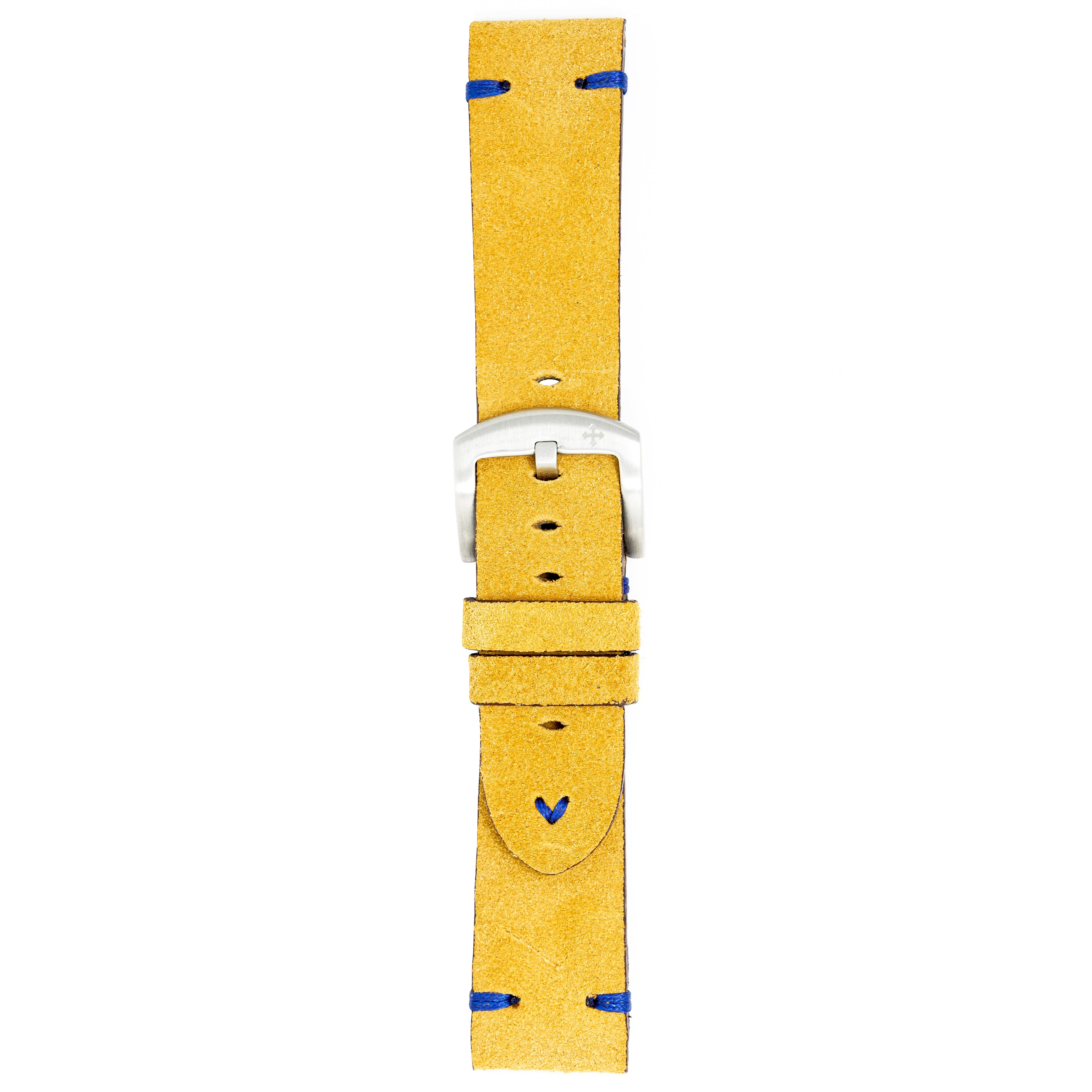 22/20mm width x 21.5cm Length Yellow Handmade in Italy Leather Strap with Blue Stitchings - Fitted With a Brushed Stainless Steel Buckle.