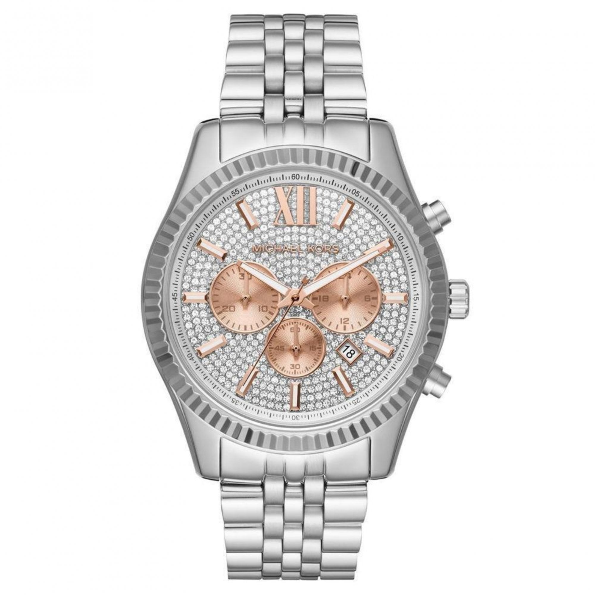 Pave Crystal Dial with Silver Tone MK Logo and Hands.