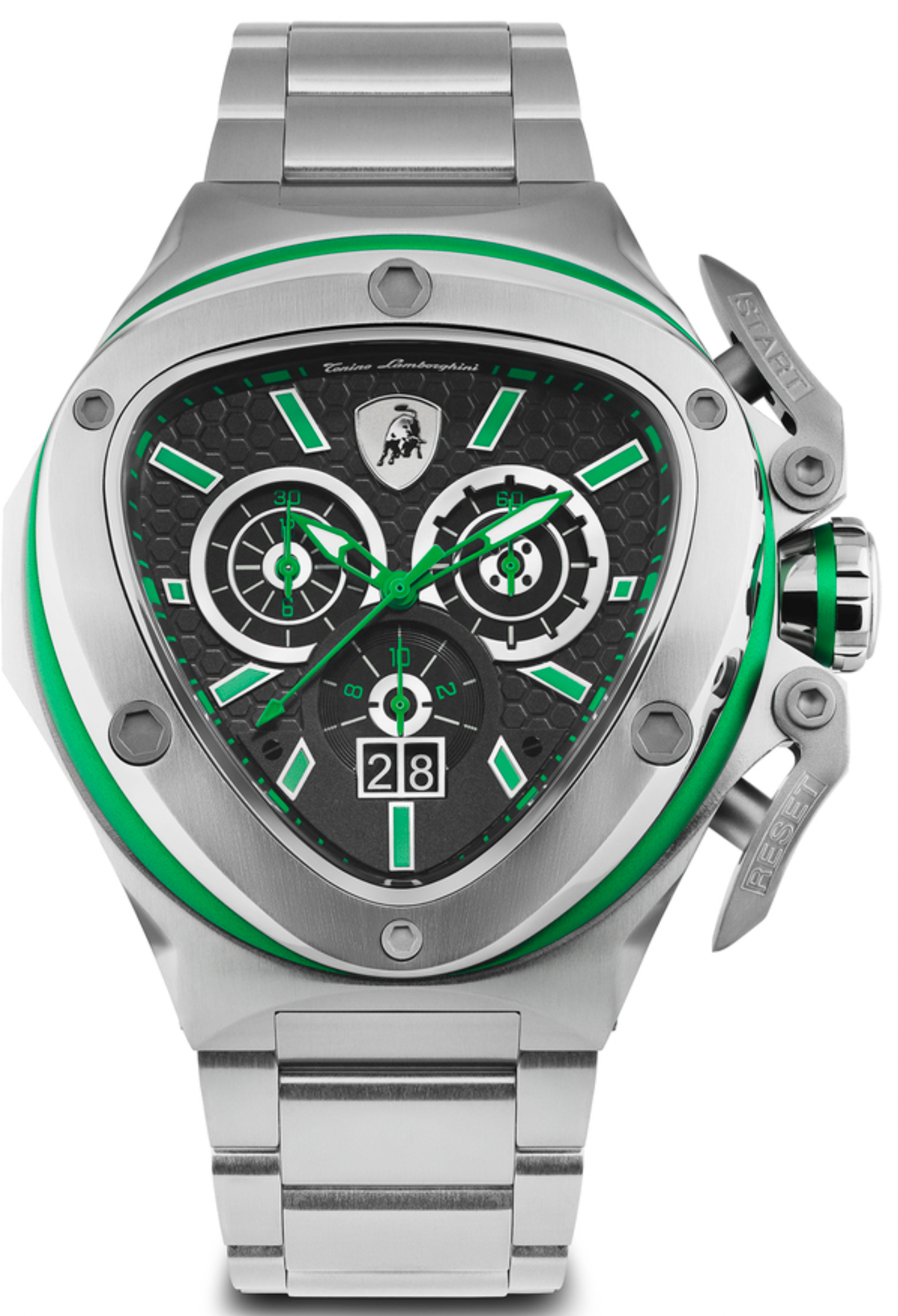 The Tonino Lamborghini Spyder X Silver/Green 53mm blends bold automotive inspiration with refined craftsmanship. Its shield-shaped stainless steel case and multi-layered bezel create a distinctive presence, while the black honeycomb dial adds visual depth beneath its vibrant green detailing.