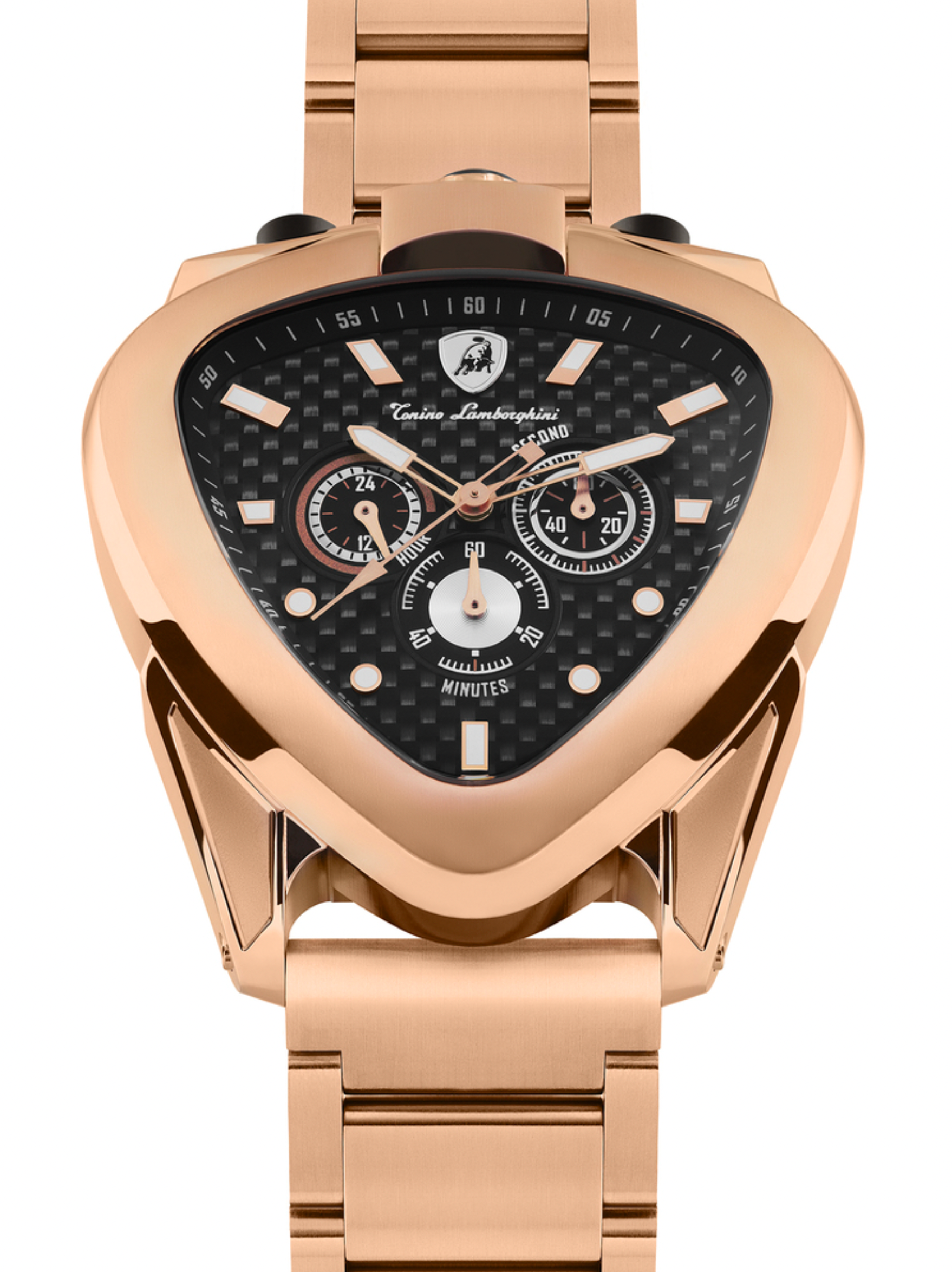Black Carbon Fibre Textured Dial - Luminous IP Rose Gold Stainless Steel Hands and White Hour Markers - Tonino Lamborghini Shield on Bezel - 3 Sub-Dials - Date at 3 O'Clock.