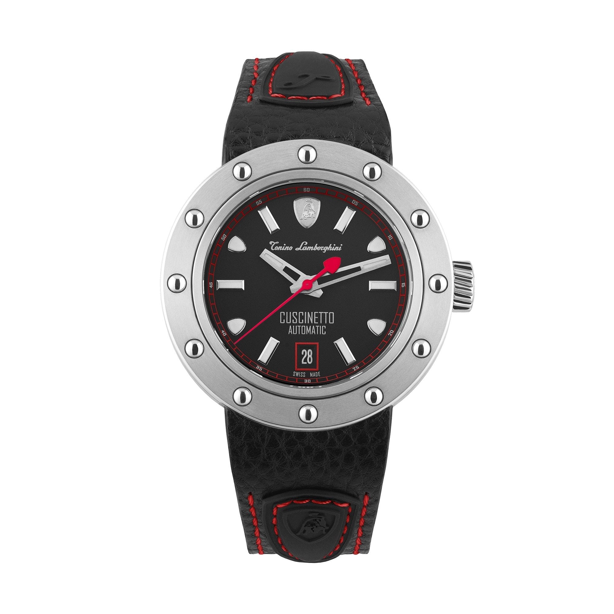 Black Leather Strap with Red Stitching and Holes - 316L Stainless Steel Deployment Buckle with Tonino Lamborghini Engraved on the Buckle.