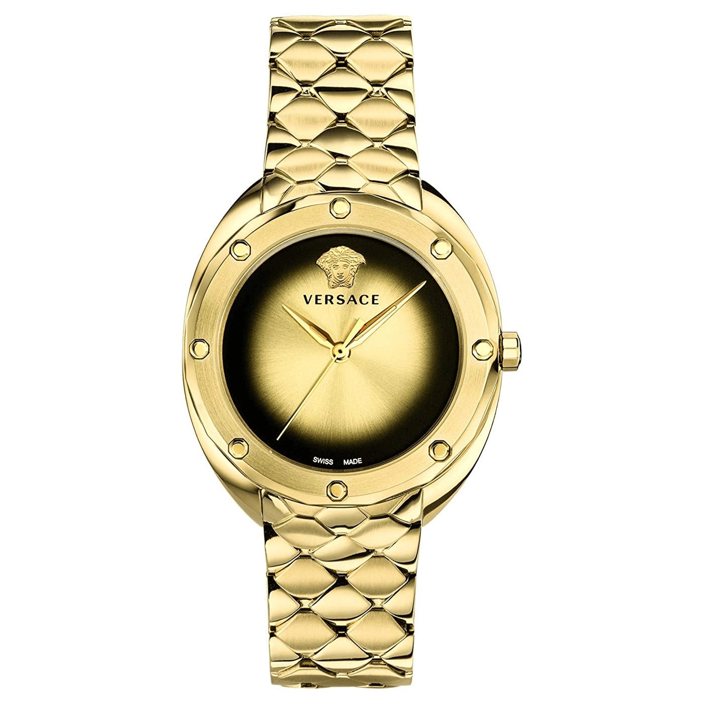 Case: 36mm x 7mm Gold IP Polished 316L Stainless Steel Case - Solid Stainless Steel Caseback with Versace Engraving - Anti-Reflective Sapphire Crystal Glass - Push-Pull Crown.