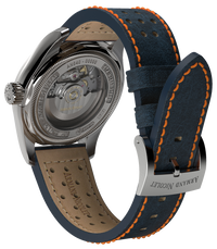 Strap / Bracelet: Blue Leather Strap With 316L Stainless Steel Tang Buckle.