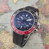 • GMT Triple Time-Zone functions: Indicated via the additional central arrow-head hour hand. This hand makes a single rotation every 24 hours & points to the desired GMT time-zone on the bezel & dial flange.