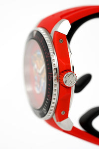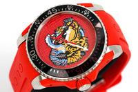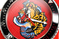 Red Textured Dial with Tiger. Super Luminova Stainless Steel Hands and Indexes. Red Seconds Hand.