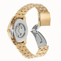 The watch is attached to a luxurious gold PVD stainless steel 5-link bracelet, finished with a combination of brushed and polished surfaces, and fastened by a fold-over deployment clasp.