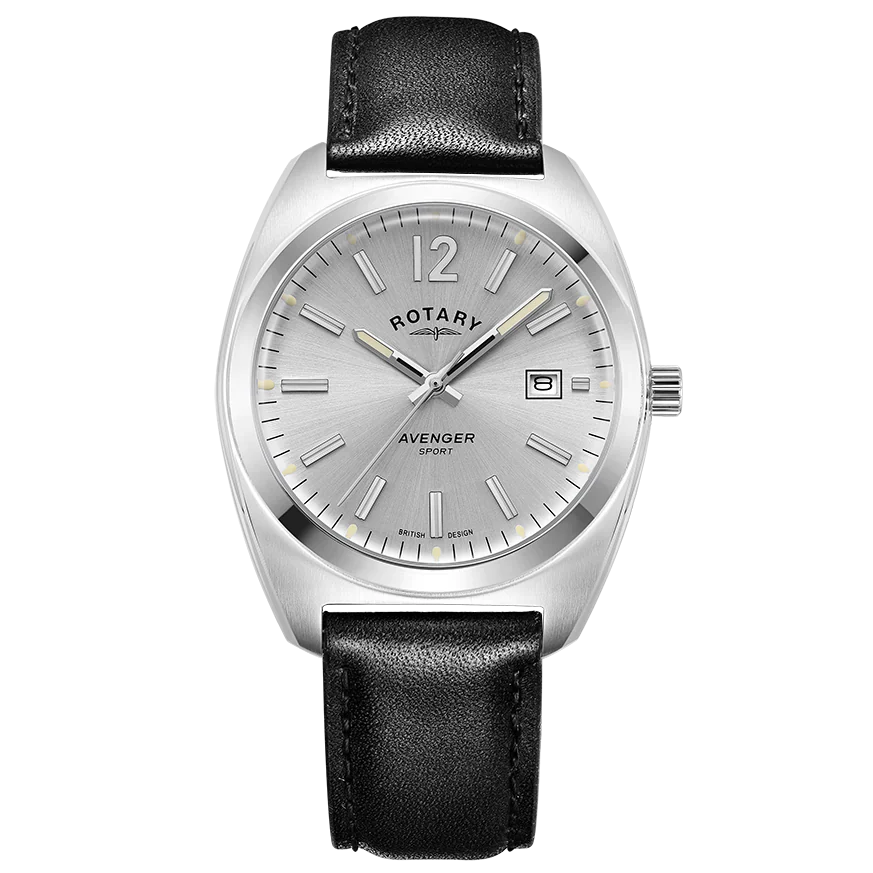 Carrying a racing retro aesthetic, the new sport Sport features a stainless steel 38mm vintage look case which frames a silver sunray dial with a date window. Bubble mineral glass married with the smooth dynamic curved side of the case reinstates a nod to the past. This timepiece features applied indices and Arabic numerals at 12; and comes with a black leather strap. This unique, quartz watch family is water resistant up to 50m. Fusing both sport and style, the this Rotary Sport draws on our rich heritage from the 1960s, blending speed and excitement with a touch of luxury.